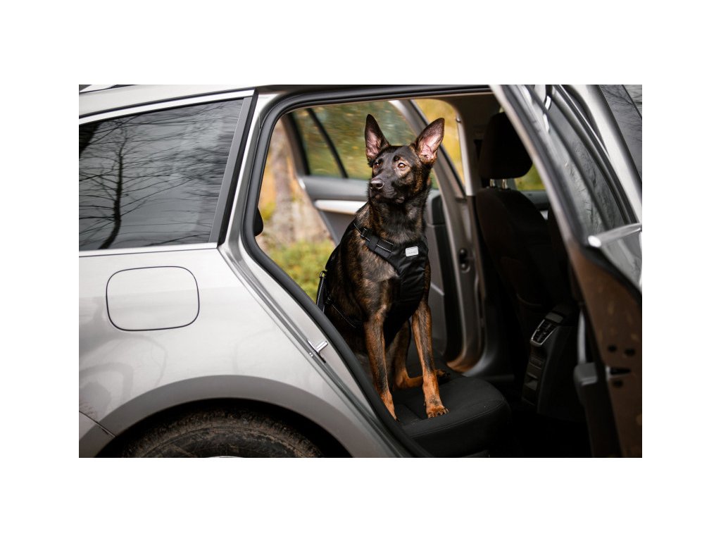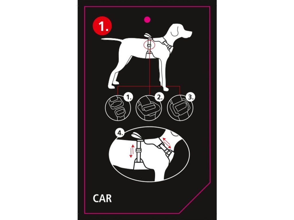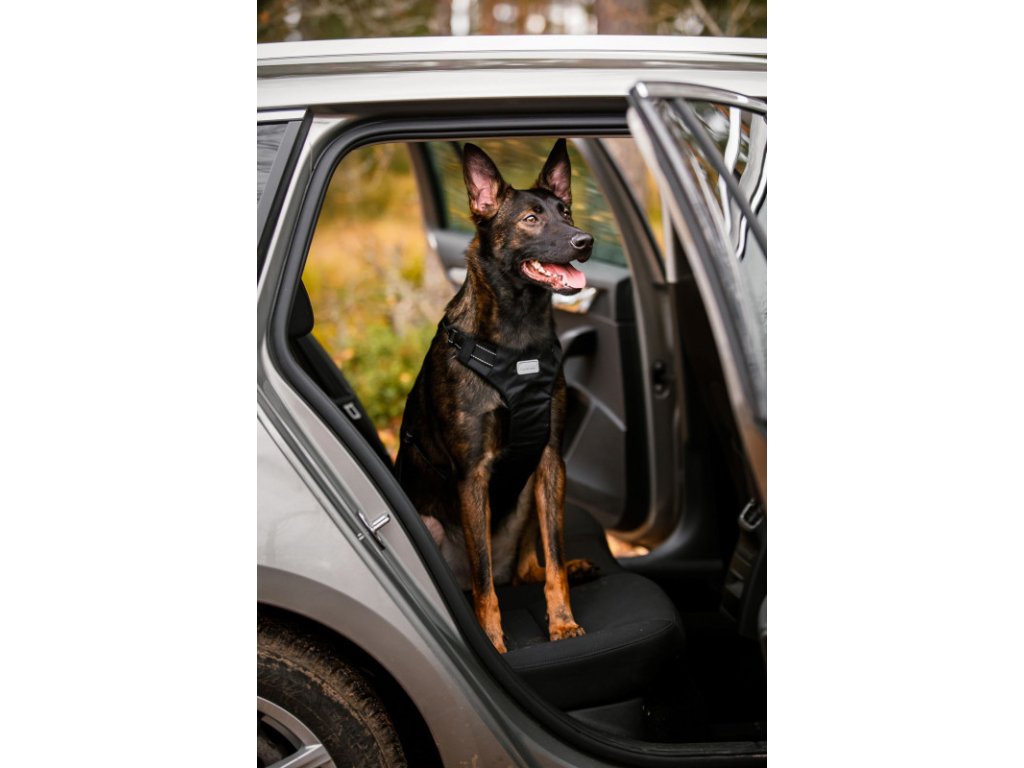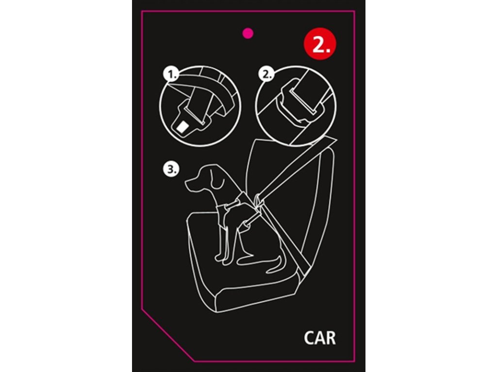 Postroj má popruh na upevnenie na bezpečnostný pás do auta, D-krúžok na zadnej strane pre samostatné uchytenie bezpečnostného pásu alebo pre vodítko. Pri používaní postroja v aute je váš pes v bezpečí aj pri náhlych pohyboch auta. Polštrovaný postroj do auta, ktorý sa ľahko oblieka a pohodlne nosí. Postroj má nastaviteľný obvod a dĺžku hrudníku, čo zabezpečí, že postroj psovi dobre sedí. Vďaka dvom kovovým sponám sa postroj rýchlo a ľahko nasadzuje. Široká hrudná časť postroja je pre psa pohodlná a zároveň rovnomerne rozdeľuje tlak na hrudník psa v prípade nárazu, či prudkého brzdenia.