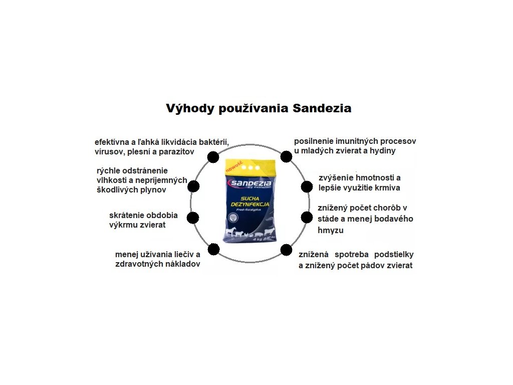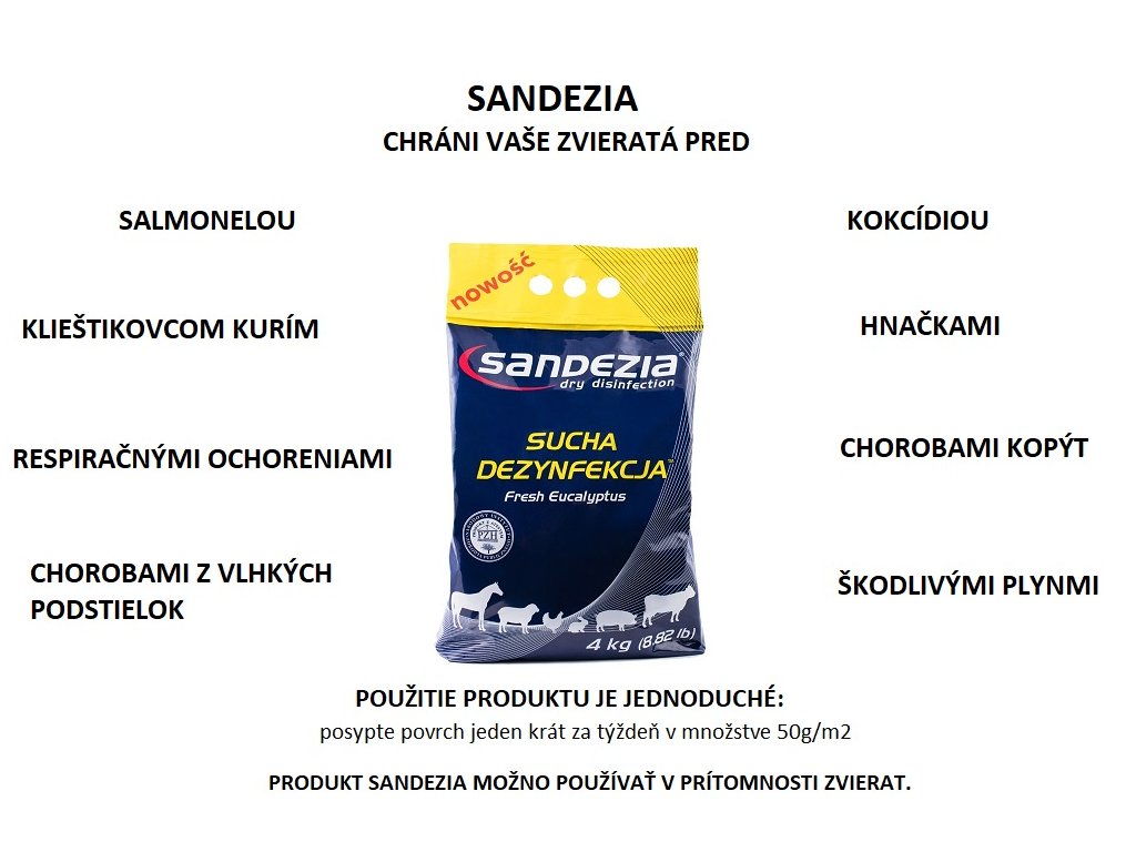 Sandezia je prípravok určený na dezinfekciu objektov pre hospodárske zvieratá. Produkt je účinný proti baktériám, vírusom, parazitom a plesniam. Ničí muchy a iný hmyz v larválnom štádiu, čím výrazne znižuje ich počet. Sandezia pôsobí hlavne vo vlhkých miestnostiach. Intenzívne vysušuje mokré podstielky, zabraňuje premene močoviny na amoniak a uvoľňovaniu škodlivých plynov. Prípravok udržuje nízke ph. Čím zabraňuje vývoju patogénnych mikroorganizmov. Znižuje počet chorôb v chove, obmedzuje používanie antibiotík a znižuje náklady na liečbu v prípade infekcie podporuje liečbu. Vhodný na dezinfekciu dopravných prostriedkov určených na prepravu zvierat a zariadení na výrobu krmiva. Prípravok je určený pre ošípané, hovädzí dobytok, kone, hydinu, norky, králiky, holuby, ovce a psy.