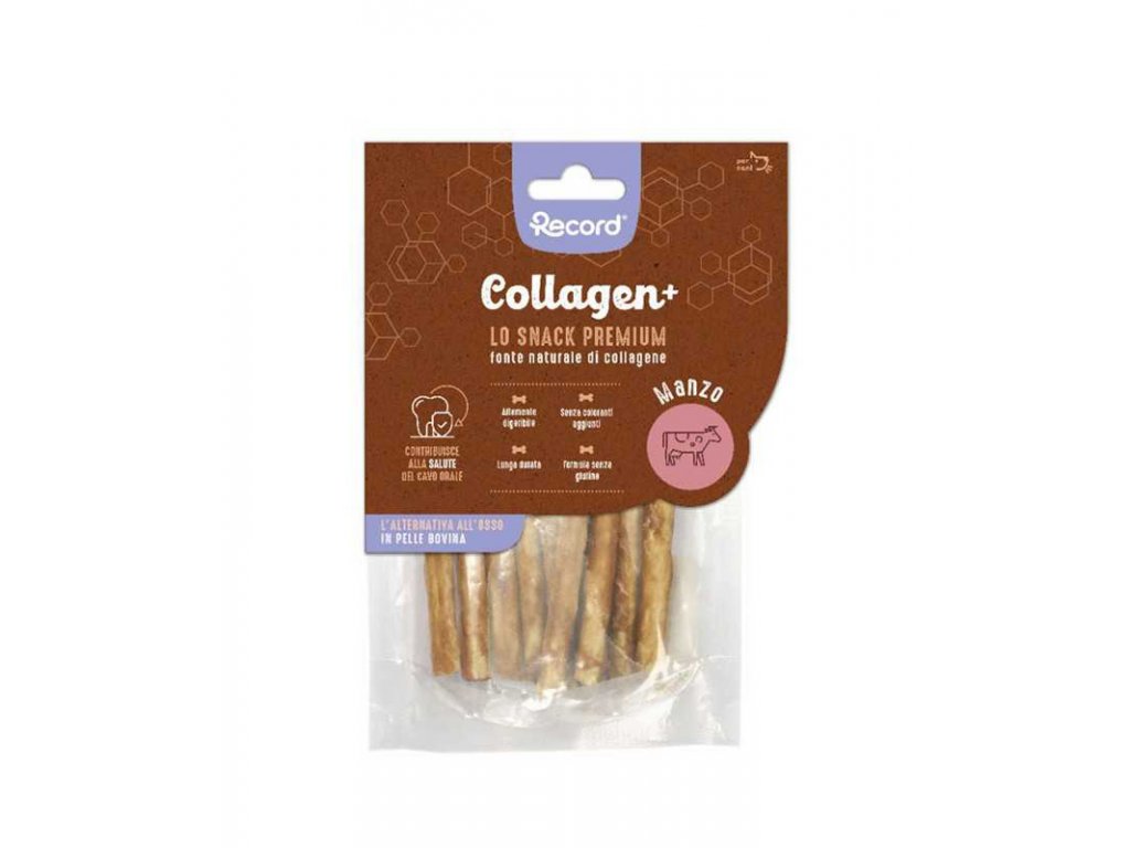 Doplnkové krmivo Collagen+ je žuvací pamlsok vyrobený z hovädzej želatíny, prirodzene bohatej na kolagén (50%) a vysoko stráviteľný proteín. Obalené v lahodnej vrstve mäsa je výbornou alternatívou kostí z byvolej kože. Žuvanie prispieva k psychofyzickej pohode psa, je emocionálne uspokojujúce, posilňuje čeľusťové svaly a mechanickým pôsobením pomáha udržiavať zuby čisté. Pre psov od 4 mesiacov veku. Dostupné v rôznych formátoch.