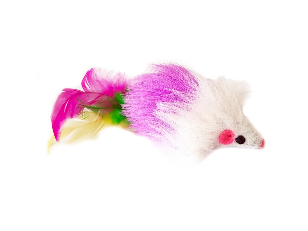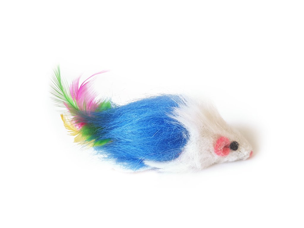 Milá hračka od talianskeho výrobcu zabaví vašu mačičku. Myška s farebnými pierkami a farebným umelým kožúškom.