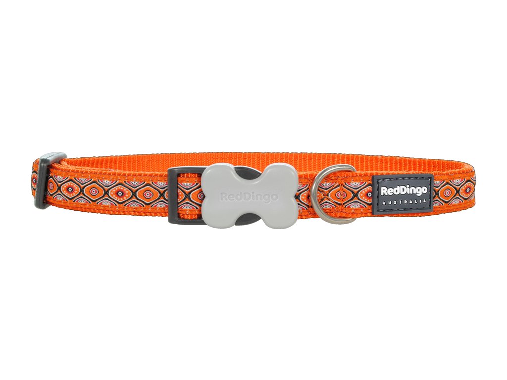 Nylonový obojok pre psa oranžovej farby so vzorom SNAKE EYES - hadie očí od austrálskej značky Red dingo. Tieto obojky sú veľmi kvalitné, trvácne, pevné a vyzerajú na psíkovi výborne. Obojky sú vyrobené z veľmi kvalitného a pevného nylonového materiálu. Jedinečná spona v tvare kosti Bucklebone je jednou z najpevnejších spôn na trhu.