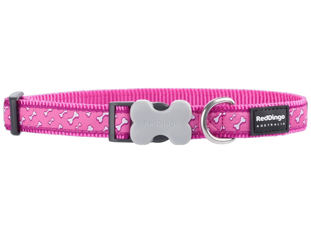Nylonový obojok pre psa s kostičkami ružový FLYING BONES od austrálskej značky Red dingo. Tieto obojky sú veľmi kvalitné, trvácne, pevné a vyzerajú na psíkovi výborne. Obojky sú vyrobené z veľmi kvalitného a pevného nylonového materiálu. Jedinečná spona v tvare kosti Bucklebone je jednou z najpevnejších spôn na trhu.
