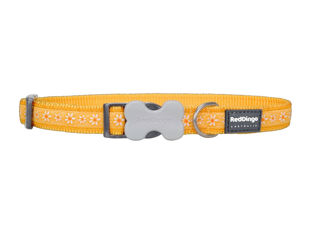 Nylonový obojok pre psa s kvietkami žltý DAISY CHAIN od austrálskej značky Red dingo. Tieto obojky sú veľmi kvalitné, trvácne, pevné a vyzerajú na psíkovi výborne. Obojky sú vyrobené z veľmi kvalitného a pevného nylonového materiálu. Jedinečná spona v tvare kosti Bucklebone je jednou z najpevnejších spôn na trhu.