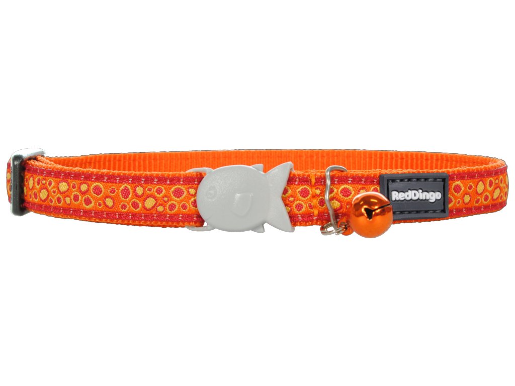 Oranžový obojok pre mačky Red Dingo so vzorom BEDROCK výborne vyzerá a spĺňa všetky požiadavky vašich mačiek. Obojky Red dingo sú navrhnuté pre ich maximálne pohodlie a bezpečnosť. Unikátna bezpečnostná spona v tvare rybičky je navrhnutá tak, aby sa rozopla pokiaľ by sa vaša mačka počas potuliek v prírode pevne zachytila obojkom o konár alebo inú prekážku. Pre ochranu voľne žijúcich vtákov a drobných zvieratiek je na našich obojkoch zavesená kovová rolnička. Vďaka kvalitnému reflexnému materiálu obojok vynikajúco odráža svetlá aut a chráni tak vašu mačku pred autami v noci.
