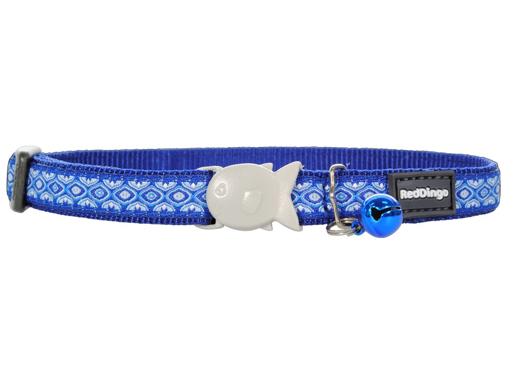 Modrý obojok pre mačky Red Dingo so vzorom SNAKE EYES výborne vyzerá a spĺňa všetky požiadavky vašich mačiek. Obojky Red dingo sú navrhnuté pre ich maximálne pohodlie a bezpečnosť. Unikátna bezpečnostná spona v tvare rybičky je navrhnutá tak, aby sa rozopla pokiaľ by sa vaša mačka počas potuliek v prírode pevne zachytila obojkom o konár alebo inú prekážku. Pre ochranu voľne žijúcich vtákov a drobných zvieratiek je na našich obojkoch zavesená kovová rolnička. Vďaka kvalitnému reflexnému materiálu obojok vynikajúco odráža svetlá aut a chráni tak vašu mačku pred autami v noci.