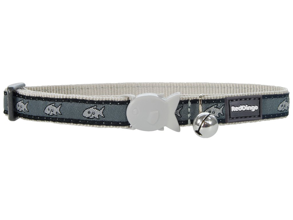 Sivý obojok pre mačky Red Dingo so vzorom SHARKS výborne vyzerá a spĺňa všetky požiadavky vašich mačiek. Obojky Red dingo sú navrhnuté pre ich maximálne pohodlie a bezpečnosť. Unikátna bezpečnostná spona v tvare rybičky je navrhnutá tak, aby sa rozopla pokiaľ by sa vaša mačka počas potuliek v prírode pevne zachytila obojkom o konár alebo inú prekážku. Pre ochranu voľne žijúcich vtákov a drobných zvieratiek je na našich obojkoch zavesená kovová rolnička. Vďaka kvalitnému reflexnému materiálu obojok vynikajúco odráža svetlá aut a chráni tak vašu mačku pred autami v noci.