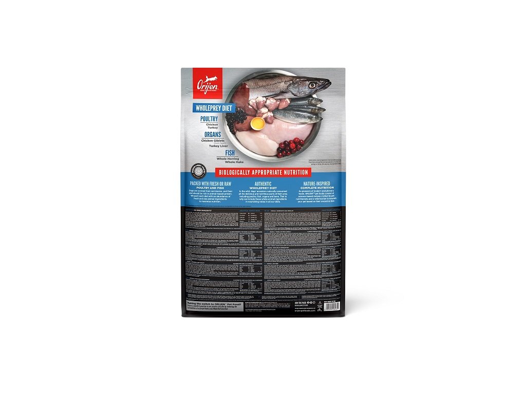 Kompletné krmivo pre všetky plemená. Granule Orijen Originál obsahuje vysoký podiel proteínov z voľne chovaných kurčiat a moriek, rýb lovených v prírodných vodách a vajec z hniezdových chovov, to všetko je dodávané čerstvé v bohatom výživnom podiele- celý kus. Plné živin, ktoré podporujú vrcholovú kondíciu a správny vývoj, zaručia krmivá ORIJEN, že váš pes bude zdravý, spokojný a silný.