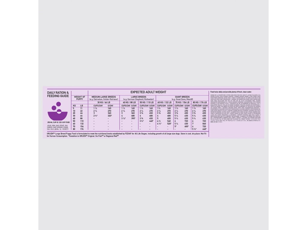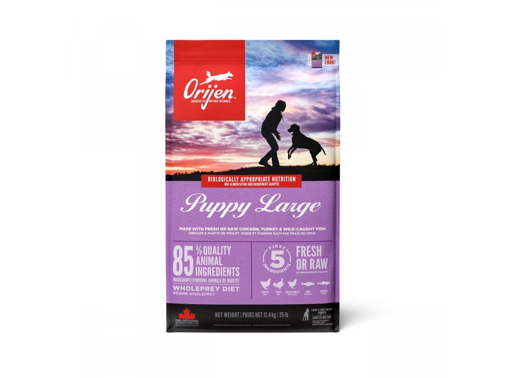 Kompletné krmivo pre šteňatá veľkých plemien psov. Granule Orijen Puppy obsahuje vysoký podiel proteínov z voľne chovaných kurčiat a moriek, rýb lovených v prírodných vodách a vajec z hniezdových chovov, to všetko je nám dodávané čerstvé v bohatom výživnom podiele Celej koristi. Plné živin, ktoré podporujú vrcholovú kondíciu a správny vývoj, zaručia krmivá ORIJEN, že vaše šteniatko bude zdravé, spokojné a silné.