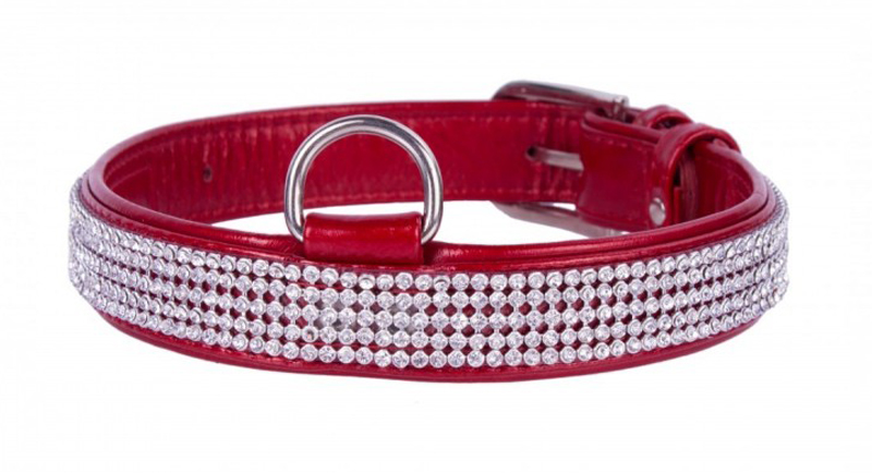 Kožený obojok s našitým pásikom s vysokolesklými kryštáľmi. Prívesok s QR kódom.