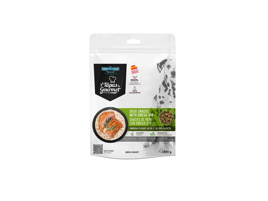 Mäkké odmeny pre psa MEDITERRANEAN NATURAL Tapas kačacím mäsom sú 100% prírodné pamlsky nakrájané na malé kúsky v tvare srdca, obsahujú min. 70% čerstvého mäsa. Obsahujú oreganový olej a rozmarín, prírodné antioxidanty, ktoré zlepšujú trávenie (stimulujú žlč) a zabraňujú bakteriálnym infekciám a pomáhajú pri správnom zažívaní gastrointestinálneho traktu. Sú bezlepkové, neobsahujú umelé farbivá, neobsahujú GMO, neobsahujú trans-mastné kyseliny, obsahujú Omega 3 a 6 mastné kyseliny.
