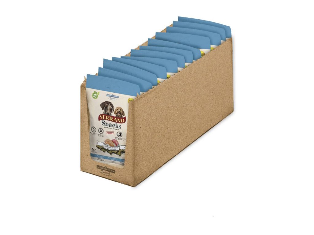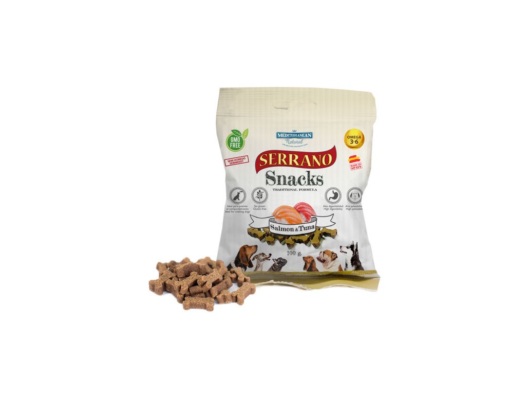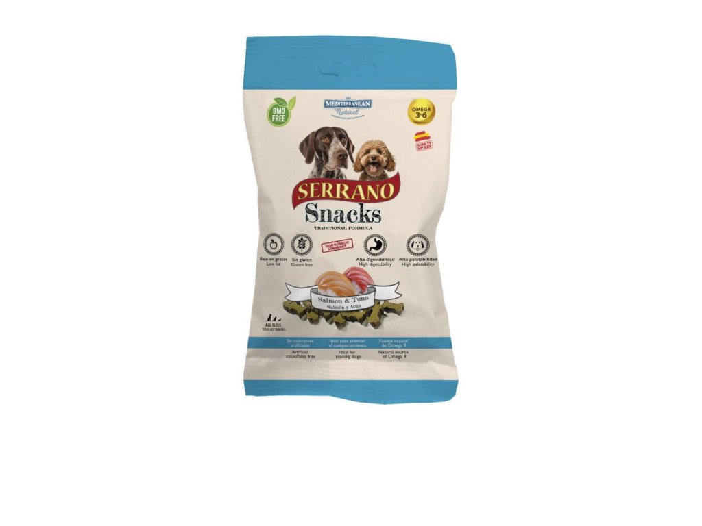 Mäkké odmeny pre psa MEDITERRANEAN NATURAL Serrano snacks s lososom a tuniakom sú nakrájané na malé kúsky v tvare kosti a obsahujú veľké množstvo čerstvého mäsa. Ideálne ako odmeny pri trénovaní alebo vystavovaní psa. Perfektná odmena alebo maškrta za dobré správanie Vášho domáceho miláčika. Vhodné pre všetky veľkosti psa.