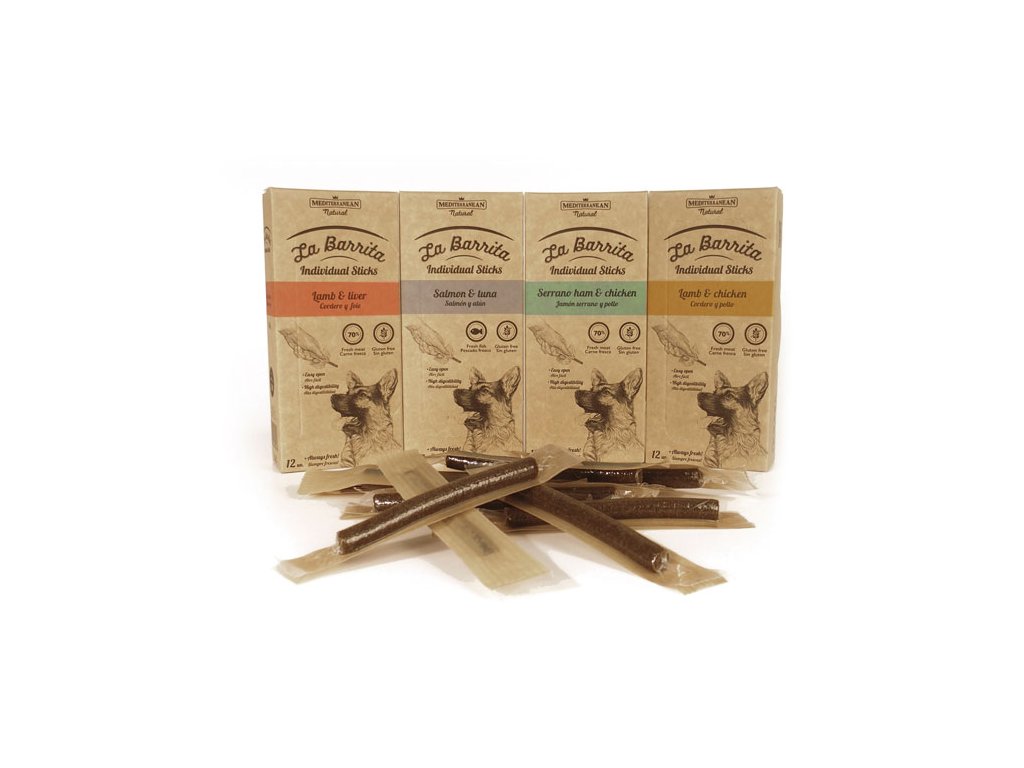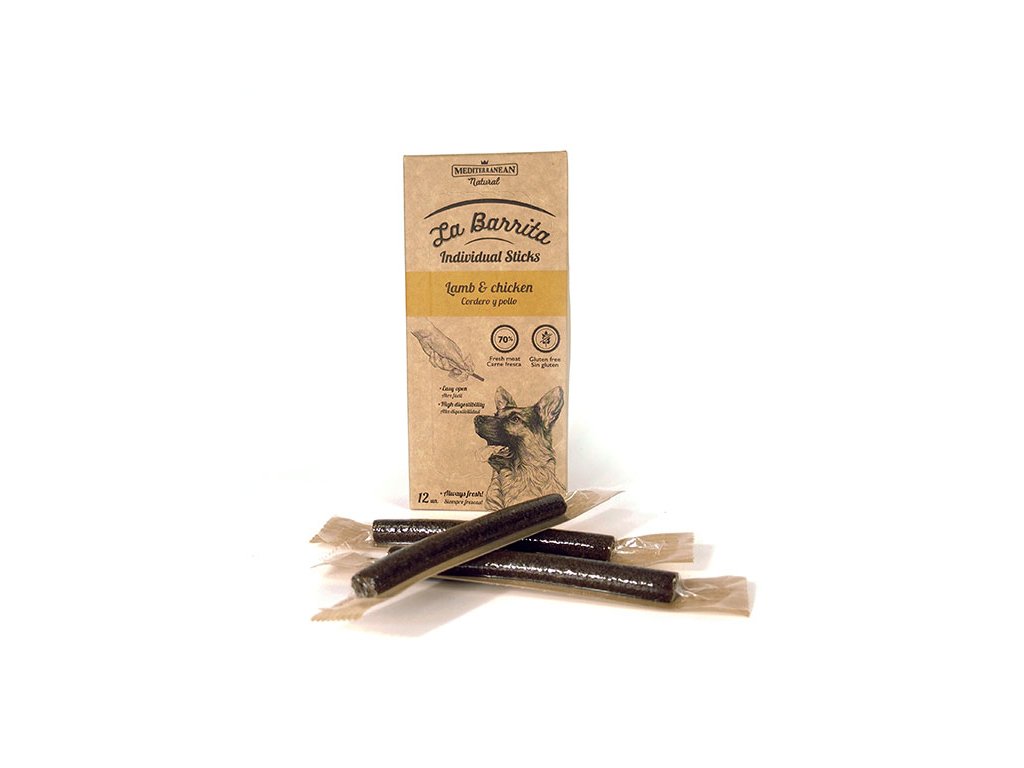 Mäkké tyčinky pre psa MEDITERRANEAN NATURAL La Barrita s jahňacím a kuracím mäsom obsahujú min 70% čerstvého mäsa. Ideálne ako odmeny pri trénovaní alebo vystavovaní psa. Perfektná odmena alebo maškrta za dobré správanie Vášho domáceho miláčika. Vhodné pre všetky veľkosti psa. Veľmi kvalitné polovlhké maškrty pre psy, ktoré sú samostatne vákuovo balené. Balenie 12 x 12,50g