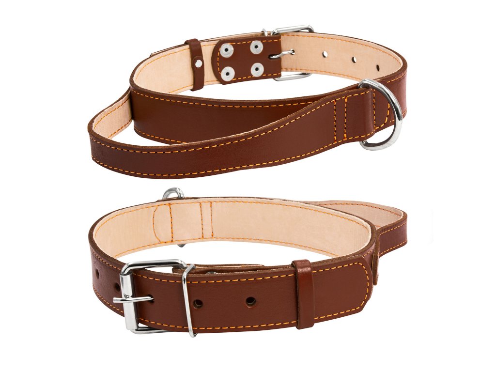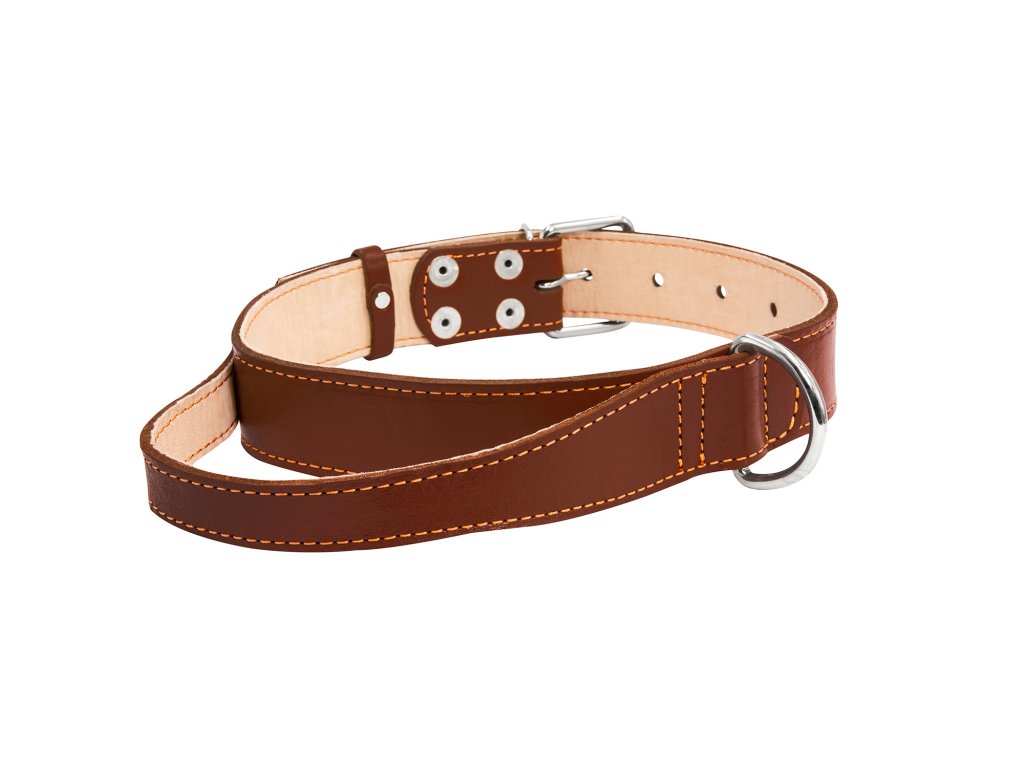 Praktický kožený obojok s rúčkou na pridržanie psa pri výcviku najmä obrany. Rúčka je dostatočne pevná, aby udržala aj silné plemená. Nie je vhodné na vychádzky do mesta ako náhrada vodítka.
