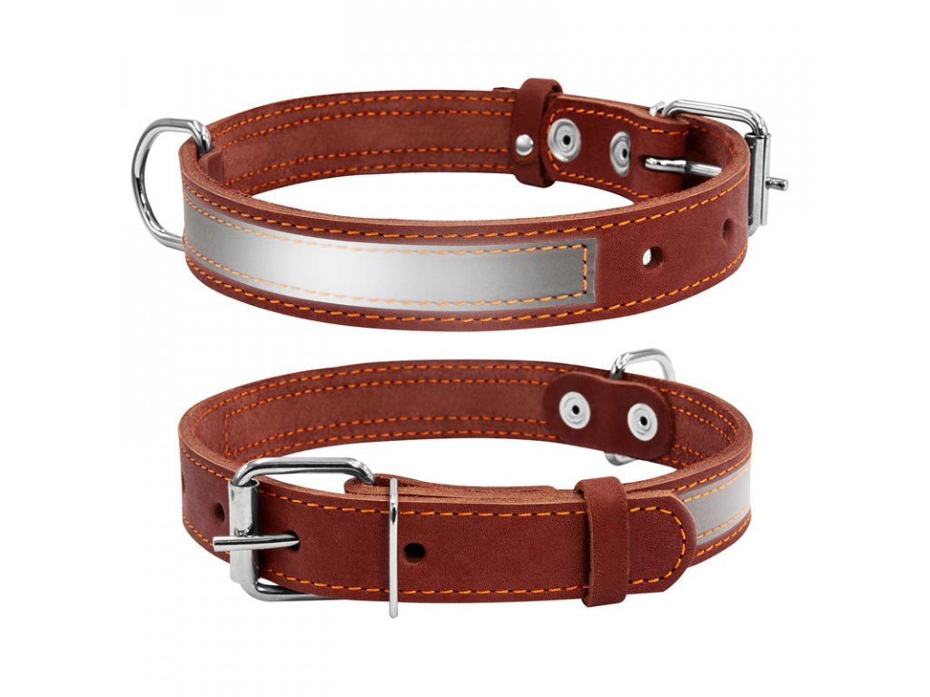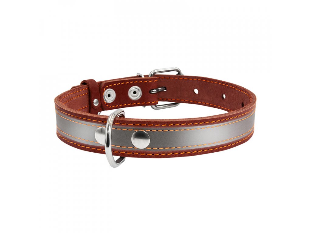 Ručne šitý reflexný obojok. Je vyrobený z kvalitnej silnej hovädzej kože, na ktorej je našitá reflexná látka (nie je nastriekaná- nezošúcha sa). Obojok je veľmi trvácny a vydrží naozaj dlho. Vďaka reflexnému obojku je Váš pes lepšie viditeľný potme a predchádzate tak prípadným nehodám. Obojok má pod prackou vrstvu kože, ktorá bráni odreninám pod zapínaním.