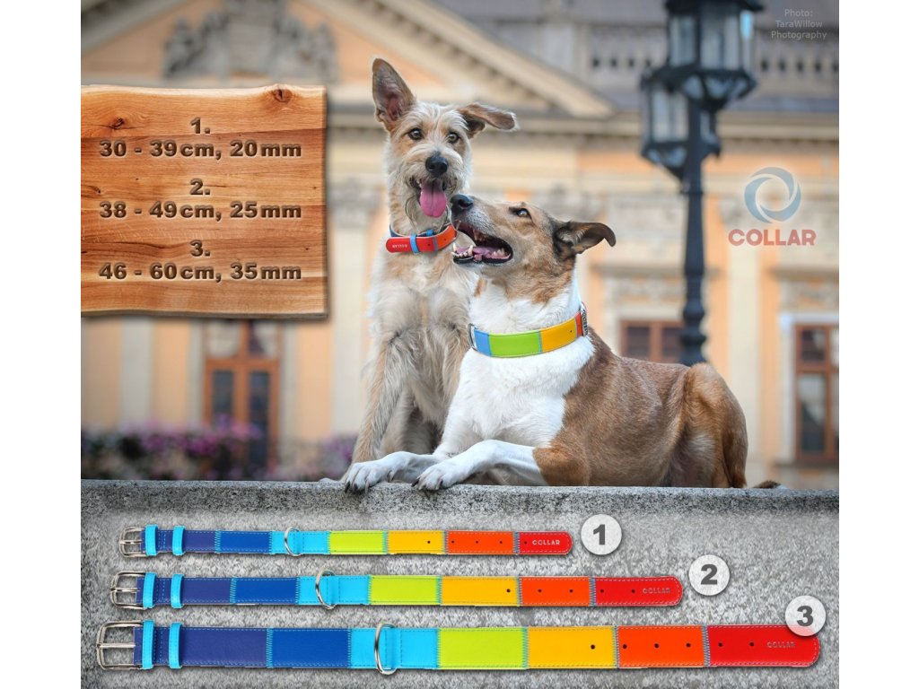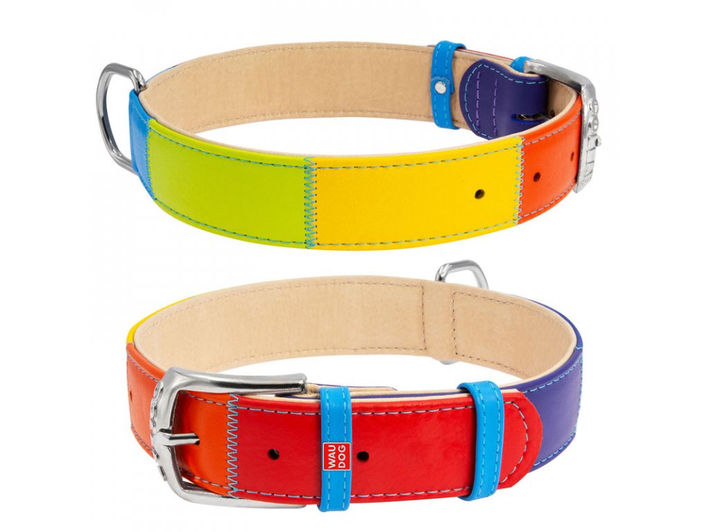 Veľmi atraktívny mäkký polštrovaný dvojvrstvový viacfarebný kožený obojok pre psa. Obojok je vyrobený z veľmi kvalitnej kože zo 7 farieb, ktoré vytvárajú "Dúhu". Koža je špeciálne farbená, nezanechá žiadne stopy na srsti vášho psa ani po namočení. Tento "dúhový obojok" je súčasťou kolekcie glamour a je vhodný pre psy s citlivou pokožkou alebo s alergiou na nylon. K dispozícii je v 3 veľkostiach, čiže tieto obojky sú vhodné pre stredné a veľké psy.
