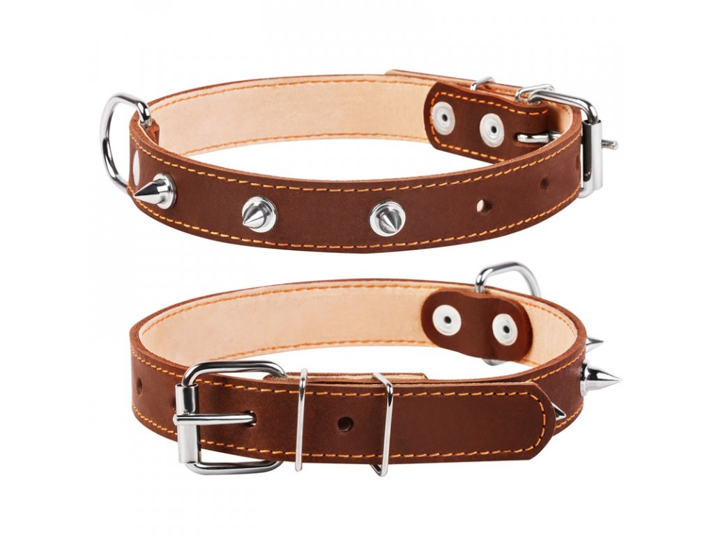 Ručne šitý a ručne vyrábaný, príjemný pre psa, vysoko kvalitný dvojvrstvový kožený obojok s kovovými ostňami, s lesklým zapínaním a pevným krúžkom. Prírodná dvojvrstvová veľmi jemná a pritom odolná koža nielenže pekne vyzerá, ale tiež poskytuje dlhotrvajúce použitie. Tieto obojky sú súčasťou našej základnej kolekcie a sú vhodné pre všetky psy ale najmä pre psov s citlivou kožou alebo alergické na nylon. Tento atraktívny obojok je vyrábaný vo veľkostiach pre stredné a veľké plemená.