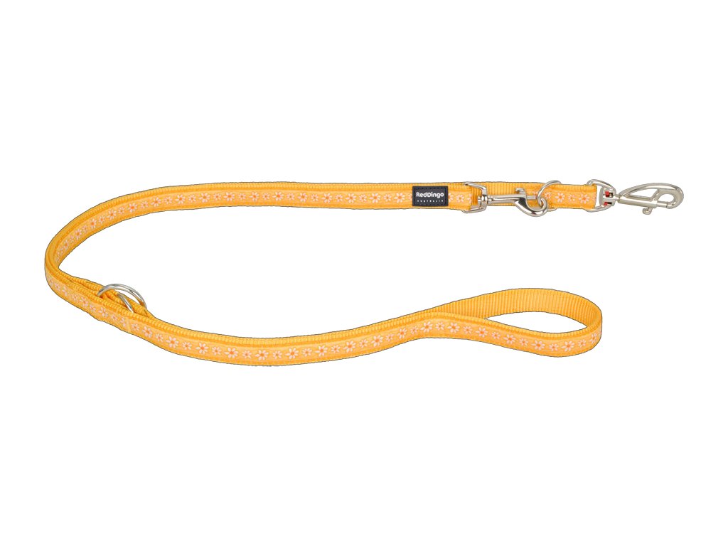 Elegantné prepínacie vodítko pre psa Red Dingo žlté s kvietkami so vzorom DAISY CHAIN. Prepínacia vôdzka má dĺžku 2,0 m a je ukončená kvalitnými karabínami primerane silnými k hrúbke vodítka s jedinečným dizajnom na oboch koncoch. Vďaka trom pevným zváraným nerezovým D-krúžkom je ľahko nastaviteľná na rôzne použitie. Multifunkčné vodítko pre psa umožňuje použiť ako vodítko na chôdzu pri nohe, vodítko pre 2 psov, rovnako ako „hands free“ vodítko. Okrem toho môže byť použité ako kratšie alebo dlhšie vodítko na fixovanie k predmetu psa pri odložení. Je skvelé pre "hands free" chôdzu v meste a tiež sa ľahko nastaví na správnej šírku chodníka (možnosť nastaviť až na 3 rôzne dĺžky).