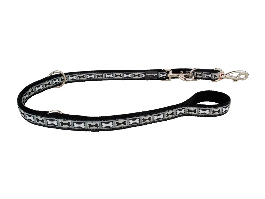 Elegantné prepínacie vodítko pre psa Red Dingo čierne s kostičkami BONE YARD. Prepínacia vôdzka má dĺžku 2,0 m a je ukončená kvalitnými karabínami primerane silnými k hrúbke vodítka s jedinečným dizajnom na oboch koncoch. Vďaka trom pevným zváraným nerezovým D-krúžkom je ľahko nastaviteľná na rôzne použitie. Multifunkčné vodítko pre psa umožňuje použiť ako vodítko na chôdzu pri nohe, vodítko pre 2 psov, rovnako ako „hands free“ vodítko. Okrem toho môže byť použité ako kratšie alebo dlhšie vodítko na fixovanie k predmetu psa pri odložení. Je skvelé pre "hands free" chôdzu v meste a tiež sa ľahko nastaví na správnej šírku chodníka (možnosť nastaviť až na 3 rôzne dĺžky).