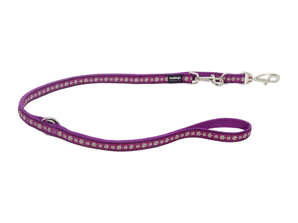 Elegantné prepínacie vodítko pre psa Red Dingo fialové s kvietkami so vzorom DAISY CHAIN. Prepínacia vôdzka má dĺžku 2,0 m a je ukončená kvalitnými karabínami primerane silnými k hrúbke vodítka s jedinečným dizajnom na oboch koncoch. Vďaka trom pevným zváraným nerezovým D-krúžkom je ľahko nastaviteľná na rôzne použitie. Multifunkčné vodítko pre psa umožňuje použiť ako vodítko na chôdzu pri nohe, vodítko pre 2 psov, rovnako ako „hands free“ vodítko. Okrem toho môže byť použité ako kratšie alebo dlhšie vodítko na fixovanie k predmetu psa pri odložení. Je skvelé pre "hands free" chôdzu v meste a tiež sa ľahko nastaví na správnej šírku chodníka (možnosť nastaviť až na 3 rôzne dĺžky).