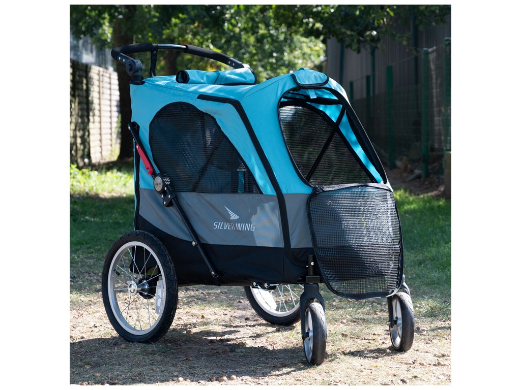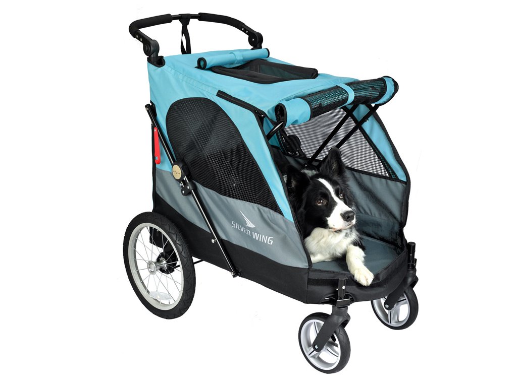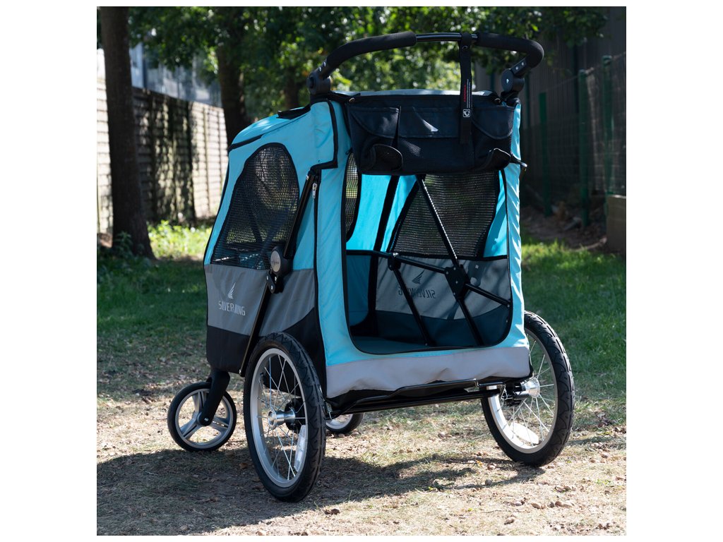 Kočík môžete tiež premeniť na štýlový otvorený kočík so skladacou strieškou. Tlačenie a riadenie je tiež bez námahy, pretože tento kočík má 4 veľké kolesá, ktoré sa dajú ľahko odobrať bez použitia dodatočného náradia. Kočiar má tiež praktické vrecko na drobnosti pre psa.