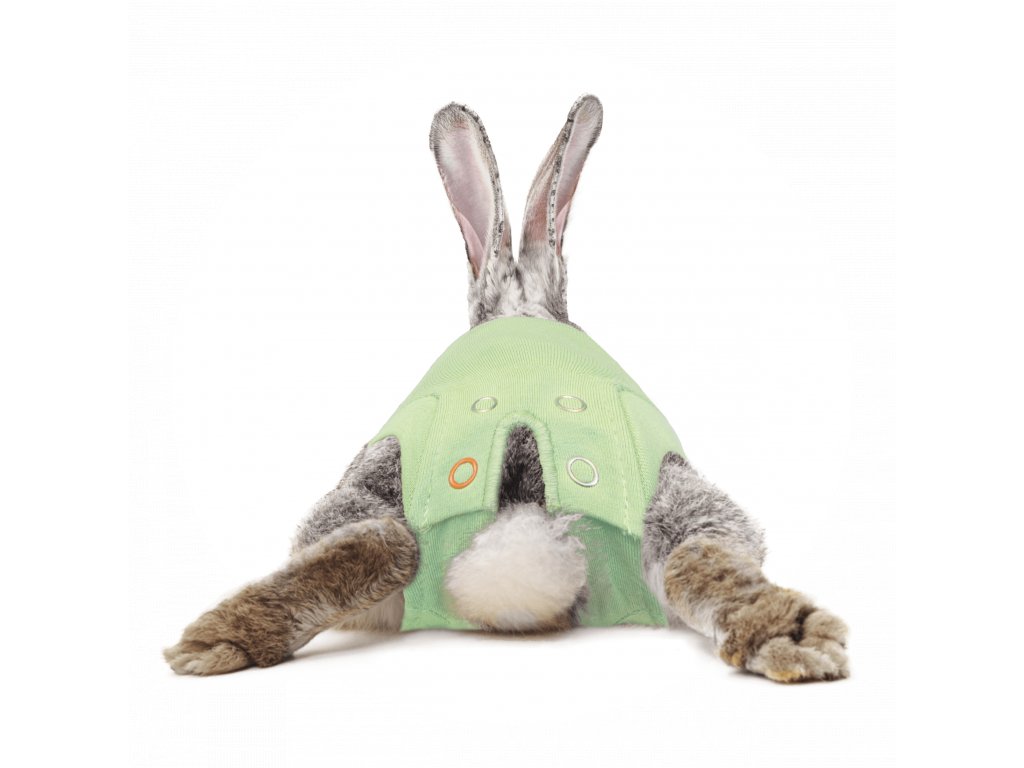 Pooperačné ochranné oblečenie pre zajaca je profesionálna alternatíva ku ochrannému golieru a ku obviazaniu celého tela zajaca. Ochranné oblečenie znižuje u zvieraťa stres, strach a neistotu po operácii. Vnútro je svetlomodré, čím môžete kontrolovať akékoľvek vytekanie tekutiny z rany a v nevyhnutnom prípade môžete vložiť vatovú vložku medzi oblečenie a telo zvieraťa. Oblečenie udrží Vášho miláčika po zákroku v teple a suchu. Vhodné pri prvej pomoci, hot spots, na ochranu rán a ochranu bandáže, kožné problémy, pri inkontinencii (úniku moču) a pod. Dizajn a vypracovanie je navrhnuté na základe tvaru tela a anatómie zvieraťa čím dokonale priľne na telo. Ochranné oblečenie pre zajaca je vyrobené z priedušnej a elastickej bavlny a Lycry čím umožňuje 100% voľnosť pohybu bez ohrozenia pevnosti, kvality a trvanlivosti. Ľahko sa nasadzuje vďaka zadnému zapínaniu. Ochranné pooperačné oblečenie pre zajace je k dispozícii v zelenej farbe. Pooperačné oblečenie je alternatíva k pooperačnému ochrannému golieru. Odporúčané špičkovými veterinármi.