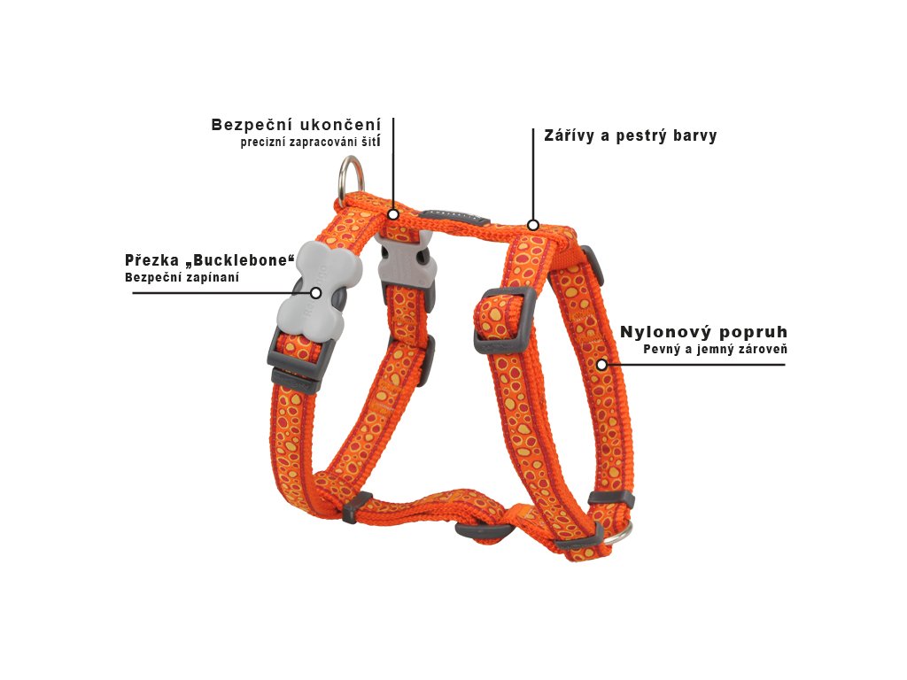 Postroje pre psy RED DINGO sú vyrobené z prvotriedneho mäkkého nylonového popruhu s D-kroužkom z nerezovej ocele. Ochranné spony sú na boku v tvare kosti. Postroje Red Dingo sú v žiarivých farbách.