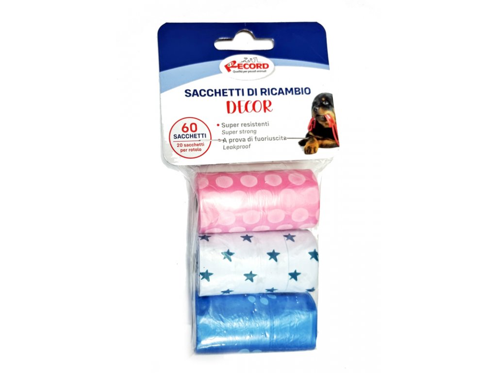 Balenie 3 kotúčov pevných sáčkov na psie exkrementy, ktoré sa zmestia do väčšiny dávkovačov a držiakov na sáčky. Každý kotúč obsahuje 20 vreciek pre všetky plemená. Sáčky majú milé vzory hviezdičiek, bodiek a labiek.