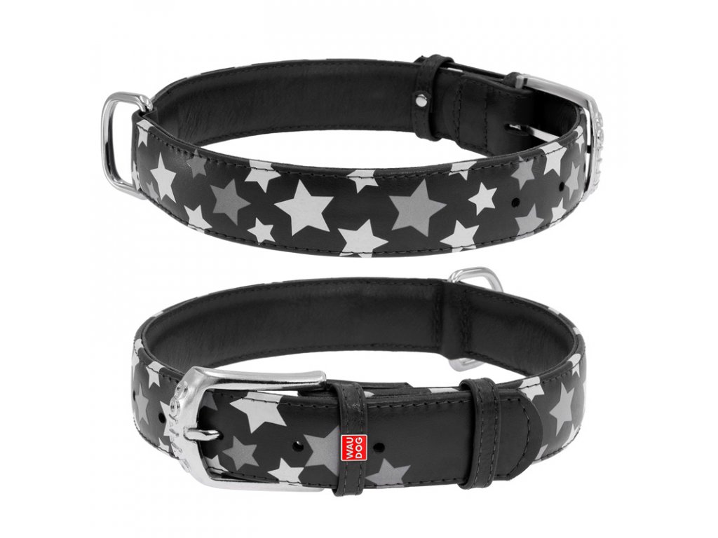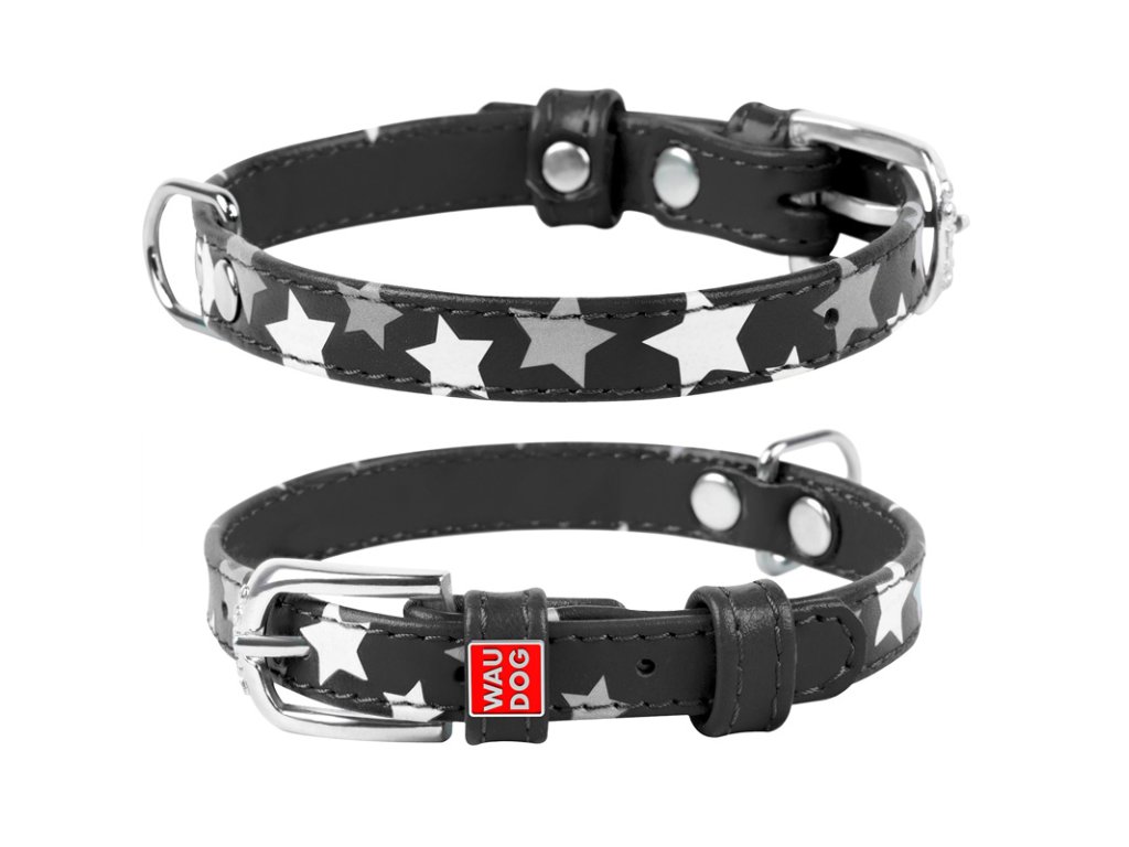 Kožený obojok s hviezdičkami čiernej farby. Kožený obojok je jedinečný tým, že obsahuje kombináciu reflexných a v tme svietiacich - fosforeskujúcich hviezdičiek. Je šitý z dvojitej vrstvy kože. Výrazné pastelové farby zvýraznia Vášho psíka. Produkty značky WAU DOG sa vyznačujú veľmi kvalitným a nápaditým spracovaním. Inovatívny rôznorodý dizajn podškrtne charakter Vášho psa a pomôže mu vyniknúť.