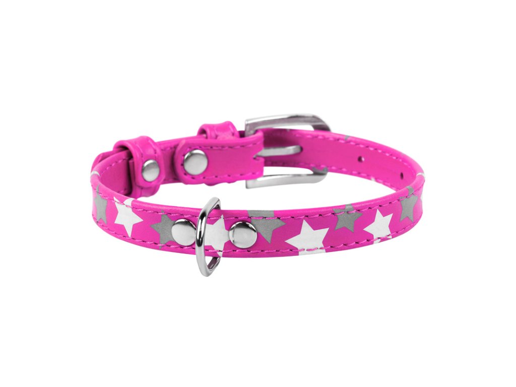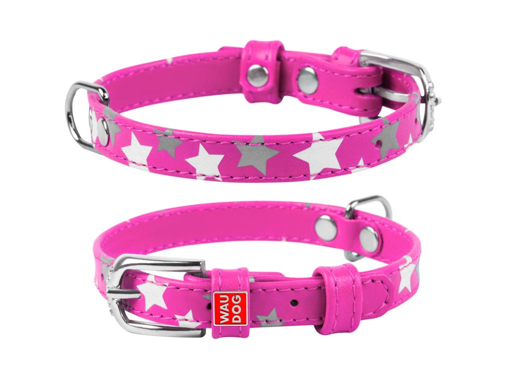 Kožený obojok s hviezdičkami ružovej farby. Kožený obojok je jedinečný tým, že obsahuje kombináciu reflexných a v tme svietiacich - fosforeskujúcich hviezdičiek. Je šitý z dvojitej vrstvy kože. Výrazné pastelové farby zvýraznia Vášho psíka. Produkty značky WAU DOG sa vyznačujú veľmi kvalitným a nápaditým spracovaním. Inovatívny rôznorodý dizajn podškrtne charakter Vášho psa a pomôže mu vyniknúť.