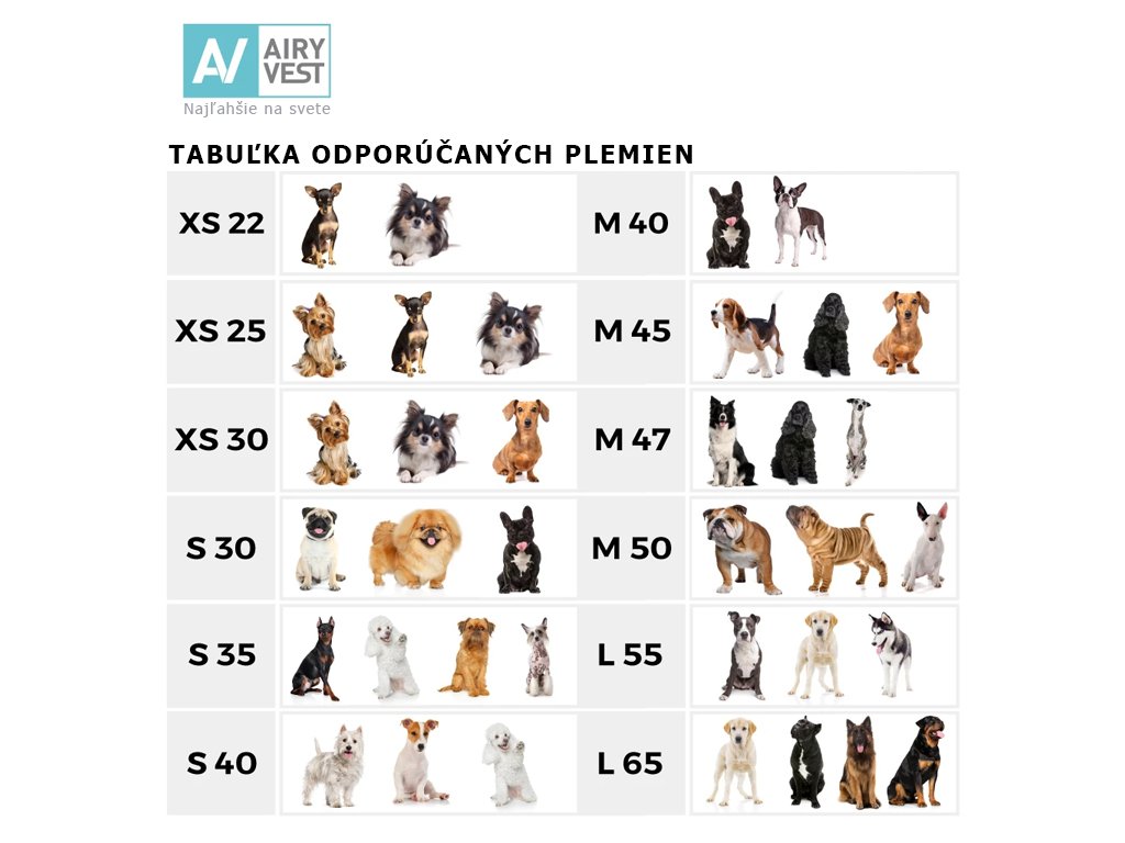AiryVest je určená pre všetky psy, ideálne pre psy, ktoré chcú vystúpiť z davu. AiryVest je vyrobená pre akciu. Oblečenie airyVest je taktiež určené pre atletické psy, ktoré neustále behajú, skáču a hýbu sa v nepriaznivom počasí. AiryVest nepokrýva celú dĺžku ako u väčšiny psov a je navrhnutá tak aby bol pes v teple a suchu. Konštrukcia AiryVest umožňuje ľahký prístup ku krku psa a ľahkému pripnutiu vodítka ku obojku.