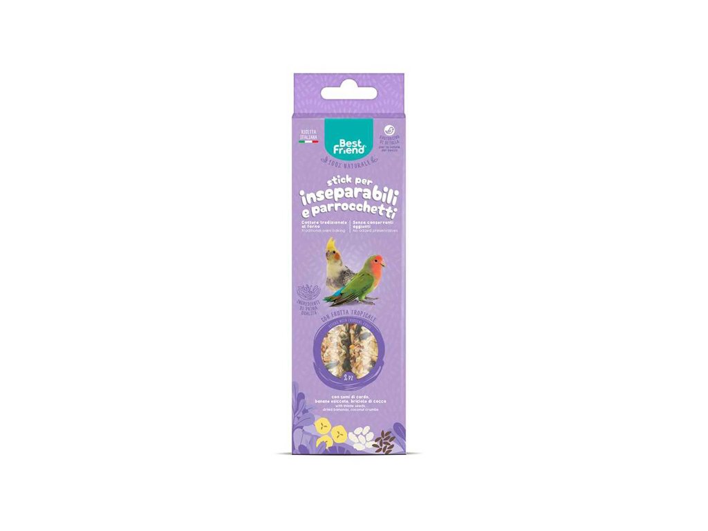 2 ks Best Friend tyčiniek sú lahodné tyčinky pre agapornisy a exotické vtáctvo vyrobené výlučne z prírodných surovín a pečené tradičným spôsobom.Lahodná tyčinka má špeciálne navrhnutý tvar a textúru na podporu správneho obrusovania zobáka a pazúrov. Obohatené o vitamíny pre zabezpečenie denného prísunu základných živín a udržania vášho domáceho maznáčika plného vitality. V balení 2 x 115 g tyčinky s vôňou tropického ovocia s kokosom, banánom, bodliakom a ľanovou strúhankou.